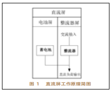 2直流屏作業原理圖1為直流屏作業原理簡圖。在圖1中,蓄電池和整流器組成了變電站的直流屏,當有交流輸入電源時,整流器作業,把交流電整流成直流電,與蓄電池一起協作,供應直流負荷安穩的直流電源。