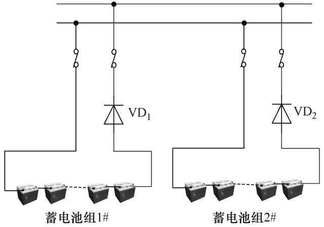 在外部溝通供電異常時(shí),蓄電池組由銜接在直流屏正極與蓄電池組正極之間的大功率二極管VD1/VD2無縫對負(fù)載進(jìn)行供電。放電通道并聯(lián)等效電路如圖4所示。在電池組并聯(lián)時(shí),即使兩組電池存在電壓差,高電壓蓄電池組與低電壓蓄電池組之間也不導(dǎo)通,不存在充電回路,故防止了環(huán)流現(xiàn)象的發(fā)生。