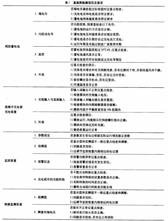 在樹(shù)立完善的點(diǎn)檢原則之前,首要有必要擬定符合現(xiàn)場(chǎng)要求,并可以作為依據(jù)的設(shè)備檢修標(biāo)準(zhǔn)。在直流屏標(biāo)準(zhǔn)中規(guī)則了直流電源體系設(shè)備檢修的基本要求,檢修前的準(zhǔn)備、檢測(cè)項(xiàng)目、充放電試驗(yàn)等內(nèi)容。直流屏主要由蓄電池.高頻開(kāi)關(guān)電源充電設(shè)備,監(jiān)控設(shè)備、絕緣監(jiān)測(cè)設(shè)備4部分組成,見(jiàn)表1。