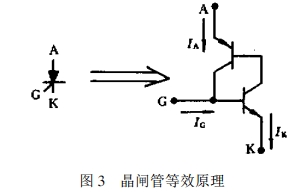 晶閘管的結(jié)構(gòu)相當(dāng)于串級(jí)雙晶體管模型P一N一P一N4層結(jié)構(gòu),因此具有3個(gè)PN結(jié),別離引出陽(yáng)極A,陰極K,門(mén)極G。在圖3結(jié)構(gòu)里不論在PNP和NPN晶體管的A一K端點(diǎn)施加正向電壓仍是反向電壓,其間的P一N一P一N結(jié)構(gòu)都處于高阻阻斷情況,只通過(guò)很小正向漏電流或很小的反向漏電流,與一般二極管的反向特性類似。一旦門(mén)極電流Ic注入G點(diǎn),就會(huì)由于構(gòu)成激烈的正反饋導(dǎo)致PNP和NPN進(jìn)入徹底飽滿情況,即晶閘管飽滿導(dǎo)通。