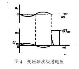 另一方面,直流屏變壓器交流側(cè)也會(huì)由于大容量負(fù)載如大變比變壓器的合閘瞬間、其它負(fù)載堵截電源時(shí)以及整流變壓器電刀閘的開(kāi)關(guān)斷開(kāi),也會(huì)由于初次級(jí)繞組間的分布電容,變壓器的鼓勵(lì)電流的驟變?cè)诖渭?jí)產(chǎn)生瞬時(shí)過(guò)電壓,其尖峰值可達(dá)作業(yè)電壓峰值的6倍以上,如圖4所示。