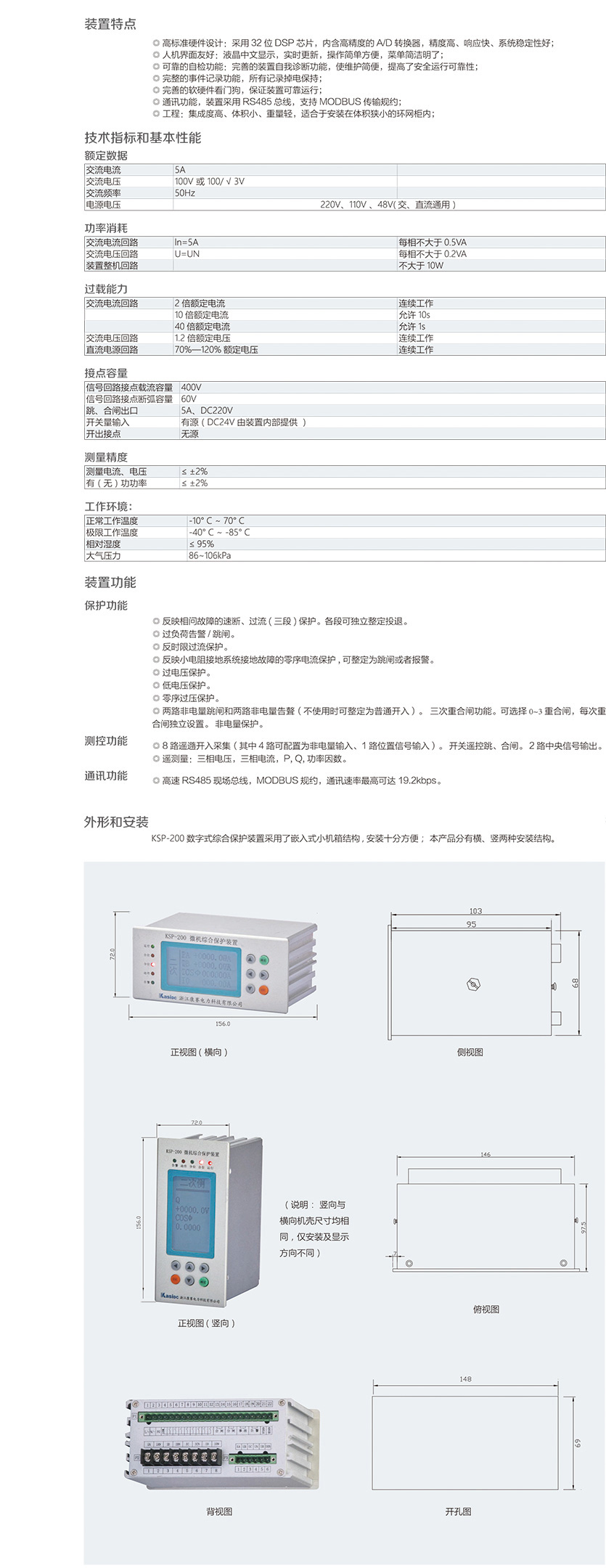KSP-200 數(shù)字式綜合保護(hù)裝置是我公司為適應(yīng)我國(guó)電氣成套事業(yè)發(fā) 展的需要,積累多年電力自動(dòng)化產(chǎn)品開發(fā)經(jīng)驗(yàn),運(yùn)用新技術(shù)、新工 藝而推出的一款經(jīng)濟(jì)性綜合保護(hù)裝置。裝置結(jié)構(gòu)設(shè)計(jì)緊湊、體積小巧, 交直流電源通用,可滿足 10KV 及以下電壓等級(jí)進(jìn)出線、廠用變等保 護(hù)測(cè)控功能。裝置適宜于安裝在體積狹小的環(huán)網(wǎng)柜內(nèi),構(gòu)成智能化 環(huán)網(wǎng)柜。